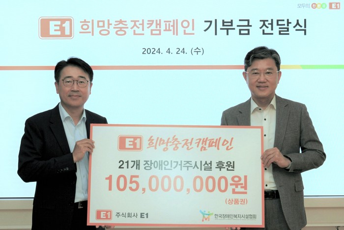 24일 서울 LS용산타워 소재 E1 본사에서 희망충전캠페인 기부금 전달식을 진행했다. E1은 2011년부터 한국장애인복지시설협회를 통해 전국 21개 장애인 복지시설에 매년 1억 500만원을 후원하는 '희망충전캠페인'을 진행해오고 있다.