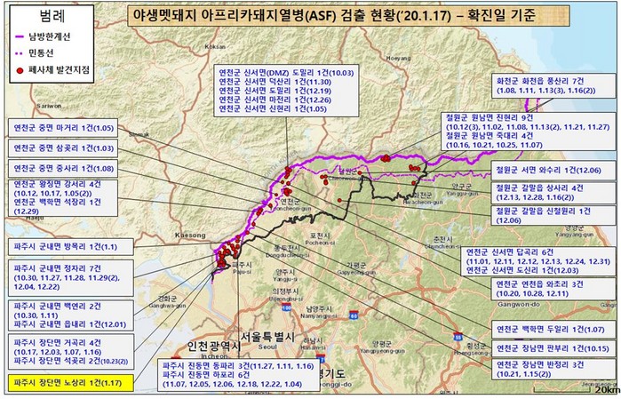국립환경과학원은 1월 17일 폐사체에서 아프리카돼지열병 바이러스를 확진하고 결과를 관계기관에 통보했다. 이로써 파주는 28건, 화천에서는 8건의 야생멧돼지 아프리카돼지열병이 확진됐으며 전국적으로는 83건이 됐다.