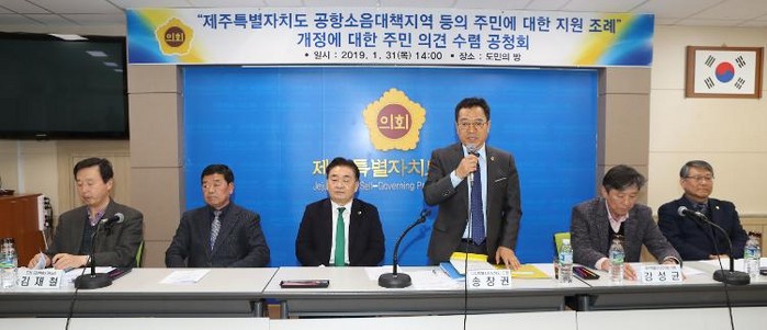 제주특별자치도의회 송창권 의원(제주시 외도동·이호동·도두동 선거구)은 31일(목) 도의회 도민의 방에서 제주특별자치도의 공항소음 대책지역 관리 현안들을 진단하고 주민지원을 위한 '제주특별자치도 공항소음대책지역 등의 주민에 대한 지원 조례' 개정에 앞서 주민 의견 수렴을 위해 공청회를 가졌다.