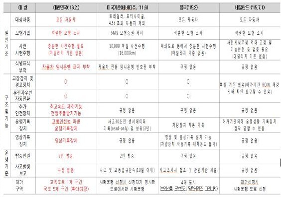| ▲해외 자율주행차 시험운행 기준과 비교 검토 (‘16.2기준) © 환경데일리 |