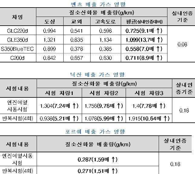 환경부는 메르세데스-벤츠코리아(주), 한국닛산(주), 포르쉐코리아(주)가 국내에 판매한 경유차량 14종 총 4만 381대에 대해 배출가스 불법조작(임의설정)으로 최종 판단, 7일 인증취소, 결함시정 명령 및 과징금을 부과하며 형사 고발한다고 밝혔다.