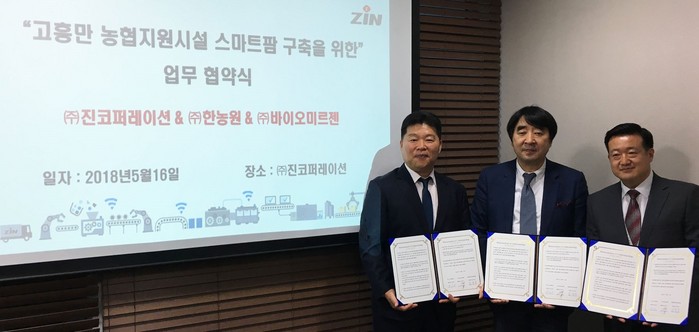 [환경데일리 한영익 기자]스마트팩토리 솔루션 전문기업 ㈜진코퍼레이션이 농업기술 전문기업 ㈜한농원, 농업경영 컨설팅 및 스마트팜 전문기업 ㈜바이오미르젠(대표 김한석)과 고흥만 농업지원시설 스마트팜 구축을 위한 업무협약(MOU)을 체결했다고 밝혔다.