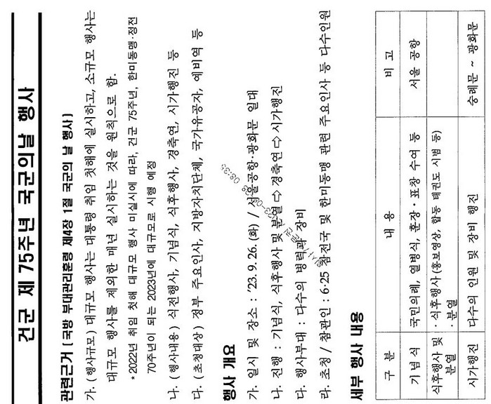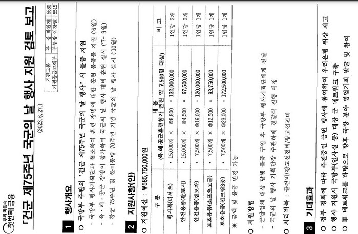 윤 정부 들어 국방부가 기획 추진한 제75주년 국군의 날 시가행진 행사를 위해 총 101억9000만원(편성 79.8억원, 추가 22.1 억원)의 예산을 편성했다. 하지만, 국방부는 예산이 부족하다는 이유로 대외기관, 단체, 대기업, 금융권을 통한 기탁과 후원까지 받고 있는 것으로 드러났다. 이 과정에서 기업들과 금융권에 후원을 요청하고 특정 금융기관은 로비용으로 후원을 했다는 의혹까지 제기되는 등 논란이 커질 전망이다.