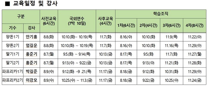 스마트 팜 국외연수는 9월부터 11월까지 품목별로 10일간 진행되며, 학습조직은 당일 교육으로 총 4회에 걸쳐 운영된다.