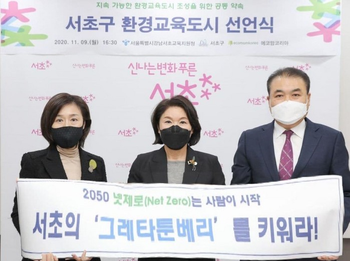 [환경데일리 추호용 기자]서울시 서초구(구청장 조은희)는 파리기후협약에 따른 신기후체제 시행을 2달 여 앞두고 2050 넷제로(탄소순배출제로)를 위해 2020년 11월 9일 서울시강남서초교육지원청(교육장 김용호), (사)에코맘코리아(대표 하지원)와 서울시 최초로 환경교육도시 선언했다.