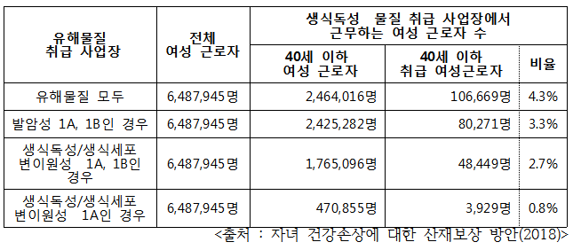 이 중 생식독성 유해물질에 노출되는 사업장에 근무하는 가임기 여성은 246만4016명이고, 이러한 물질을 취급하는 여성노동자는 10만6669명로 추산했다. 생식독성의 위험성이 큰 생식독성/생식세포 변이원성 1A을 취급하는 40세 이하 여성노동자도 3929명이나 되는 것으로 나타났다.