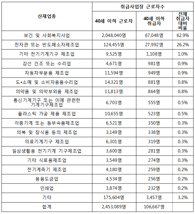 세부 산재 업종별로 전체 생식독성 노출 및 취급현황을 보면, 보건 및 사회복지사업이 6만7048명으로 전체의 취급자의 62.9%를 차지했다. 전자관 또는 반도체소자제조업이 26.2%로 그 다음으로 많았다. 이 두 업종이 전체 생식독성 취급자의 88%를 차지했다.