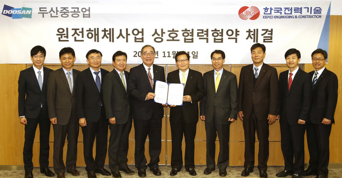 두산중공업은 원전 주기기 제조를 전문으로 하는 기업으로서 2017년 영구 정지 후 해체를 앞두고 있는 고리 원전 1호기에 최적화된 해체 기술 개발에 매진 중이다. 이를 위해 9월 원전해체 전문기업인 독일 짐펠캄프와 협력협약을 맺었다.