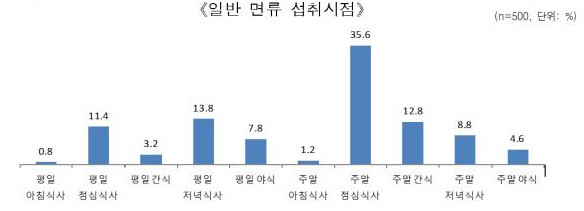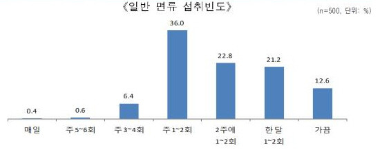 소비자 태도조사에서 일반 면류 섭취는 ‘주 1~2회’가 36.0%로 가장 높게 나타났고, 전체 응답자의 87.4%가 한 달에 1번 이상 일반 면류를 섭취하는 것으로 나타났다.