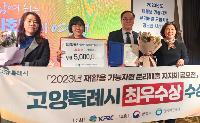 [환경데일리 김영민 기자]자원순환사회의 첫 걸음은 철저하고 자발적인 생활쓰레기 분리수거다. 고양특례시가 24일 환경부와 한국환경공단이 후원하고 (사)한국포장재재활용공제조합이 주최한 '2023년 재활용가능자원 분리배출 모범시설 공모전'에서 지자체 부문 최우수상(환경부장관상)을 수상했다.