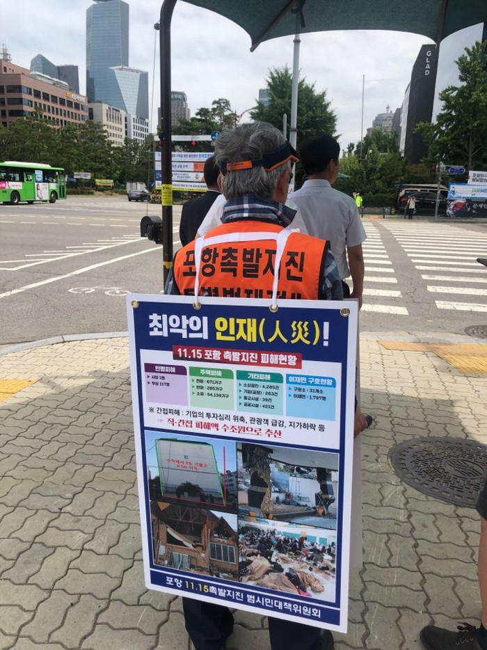 ▲지난해까지 포항지진이 자연재해가 아닌 인재때문이라고 국회 정문에서 피켓시위가 이어졌다. 하지만 산업부 등 관련기관은 침묵했다. 사진 김영민 기자 |