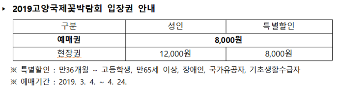 2019고양국제꽃박람회는 4월 26일부터 5월 12일까지 일산 호수공원에서는 꽃 문화 축제로, 화훼 생산현장 ‘원당화훼단지’에서는 체험과 견학 중심으로 개최된다. 예매권은 4월 24일까지 네이버, NH농협은행 등에서 현장권보다 저렴하게 구매할 수 있다. 문의 : 031-908-7750~2