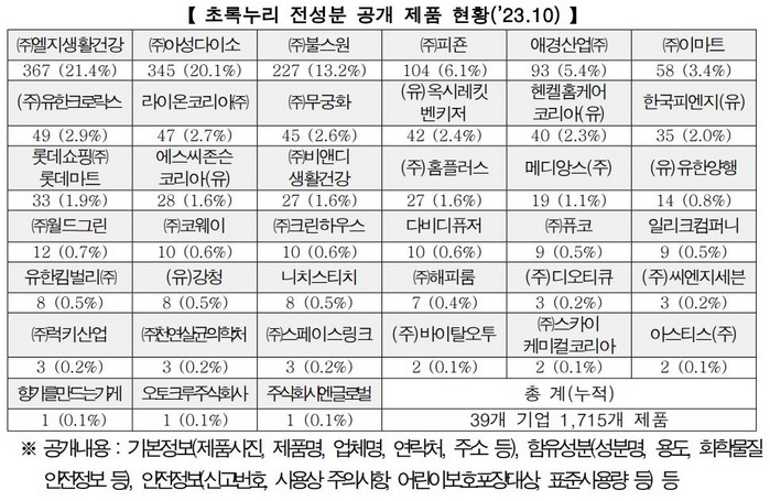 올해 11월 기준으로 협약 참여기업들은 총 1715개 제품에 대해 함유된 모든 화학성분의 정보를 확인하여 공개했고, 기업 스스로 국민 건강에 위협을 줄수 있는 유해 원료 사용을 저감하고 안전한 원료 물질로의 변경에 앞장섰다.