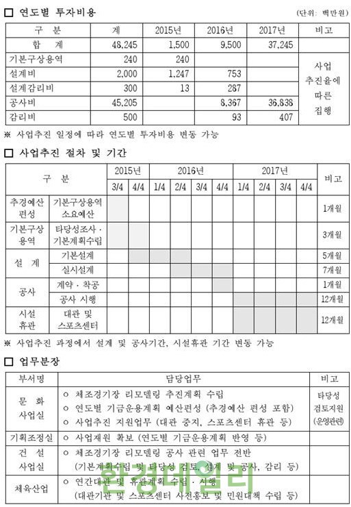 더불어민주당 노웅래 국회의원(서울 마포갑, 교육문화체육관광위원회)이 나라살림연구소(소장 정창수)와 함께 2016년 문화체육관광부 결산자료를 공동 분석한 결과에 따르면, 체조경기장 리모델링 사업은 482억원의 대규모 예산이 투입되는 사업임에도 불구하고 정부 예산 반영과 국회 예산 심의 등의 일반적인 절차를 거치지 않은 채, 기금운용계획 변경을 통해 졸속 추진된 것으로 확인됐다.