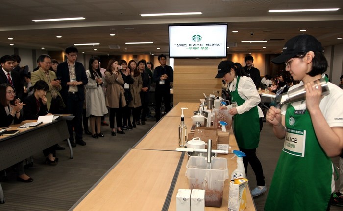 스타벅스는 2007년부터 장애인 채용을 시작으로 2012년에 한국장애인고용공단과 고용증진 협약을 체결하고 장애인 바리스타 채용과 직업훈련에 앞장서고 있다. 올 4월 기준 현재 청각, 지적, 정신, 지체 등 총 125명의 장애인이 근무하고 있다.