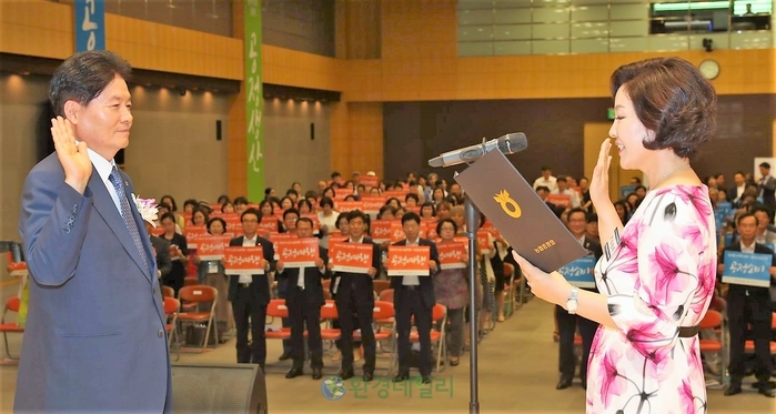 ▲중년여성농업인CEO연합회를 이끌 초대 이현주 회장(사진 오른쪽)이 창립식에서 선서를 통해 공정농업 문화창달에 역할을 성실하게 수행하고 국가 백년대계의 농업분야 발전에 이바지하도록 모든 여성농업인과 함께 나아가겠다고 밝혔다. |