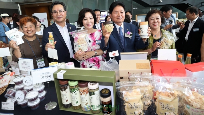 | ▲김병원 농협중앙회장(오른쪽에서 두 번째), 중년여성농업인CEO연합회 이현주 회장(오른쪽에서 세 번째) 등 참석자들이 창립총회를 마치고 현관에 전시된 여성농업인 CEO들이 만든 제품을 둘러보고 기념촬영을 하고 있다. |