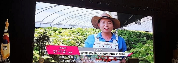 ▲거창군 딸기로 유명한 봉농원이 이날 여성농업인 CEO 김이순 대표가 영상으로 통해 연합회 가입 계기에 대해 설명하고 있다. 본지는 김이순 대표 봉농원에서 재배하는 일품 딸기밭을 소개한 적이 있다. 김이순 대표의 남편 류지봉 공동대표는 신지식농업인 으로 최고농업기술 명인 딸기박사로 유명하다. 4월 20일자 기사제목 '딸기농장 학생들 체험학습장으로 인기' |
