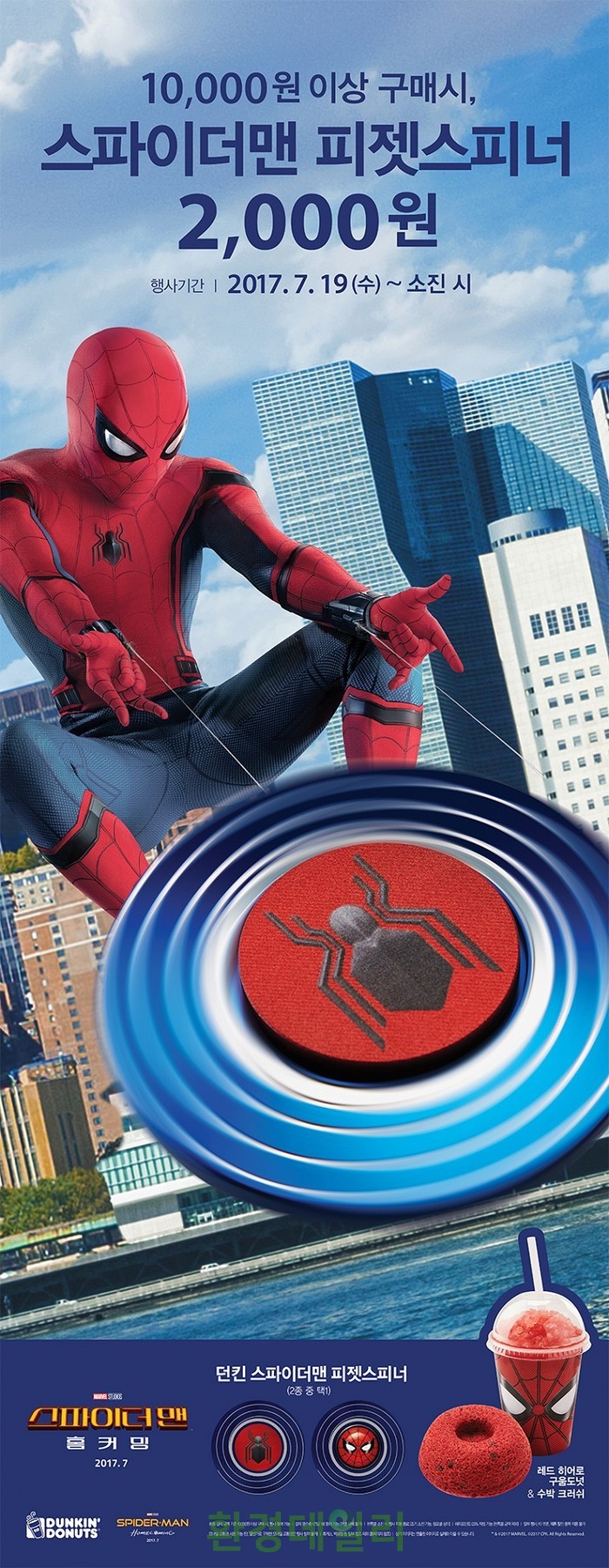이번 프로모션은 기간 중 도넛과 음료 등을 1만원 이상 구입하면 스파이더맨 피젯스피너를 2000원에 제공하는 행사다. 피젯스피너는 각각 '거미 엠블럼'과 '스파이더맨 얼굴'이 새겨진 2종 중 1종을 고를 수 있다. 전면부는 붉은색, 날개는 푸른색으로 꾸며져 '스파이더맨' 캐릭터 특징을 살렸다.
