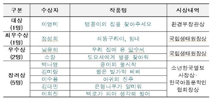 최우수상 수상자 정성희 씨의 작품 '쇠똥구리야, 힘내'는 지구에 마지막 남은 쇠똥구리 가족이 자연 친구들의 도움으로 멸종 위기를 극복해 나가는 이야기를 다룬 작품이다. 총 9편의 수상작은 자연환경 훼손으로 멸종 위기에 놓인 동물, 조류 충돌의 심각성, 쓰레기로 인한 해양 생태계 파괴 등 현재 인류가 당면한 시의성 있는 주제들을 다루고 있다.