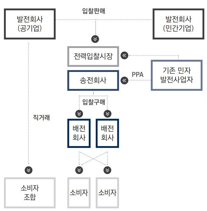 2000년대 초반 전력산업 구조개편을 진행하던 중 멈춘 상태로 비효율이 누적돼 왔다. 대부분 OECD국가의 도매와 소매 전력시장은 우리나라보다 다양한 방식으로 재생에너지의 유통이 가능하다.