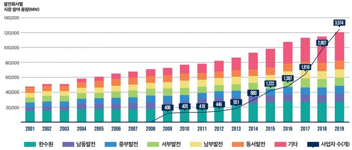 2001년에는 발전시장에 10개의 발전사업자가 존재했다. 2020년 기준 4000개를 돌파해 2001년 대비 400배로 늘었다. 그중 신재생에너지 발전 사업자가 97%인 3868개를 차지한다. 발전사업자는 폭발적으로 늘어난 데 비해 이를 전기사용자에게 제공하는 판매사업자는 여전히 한전 1개뿐이다.
