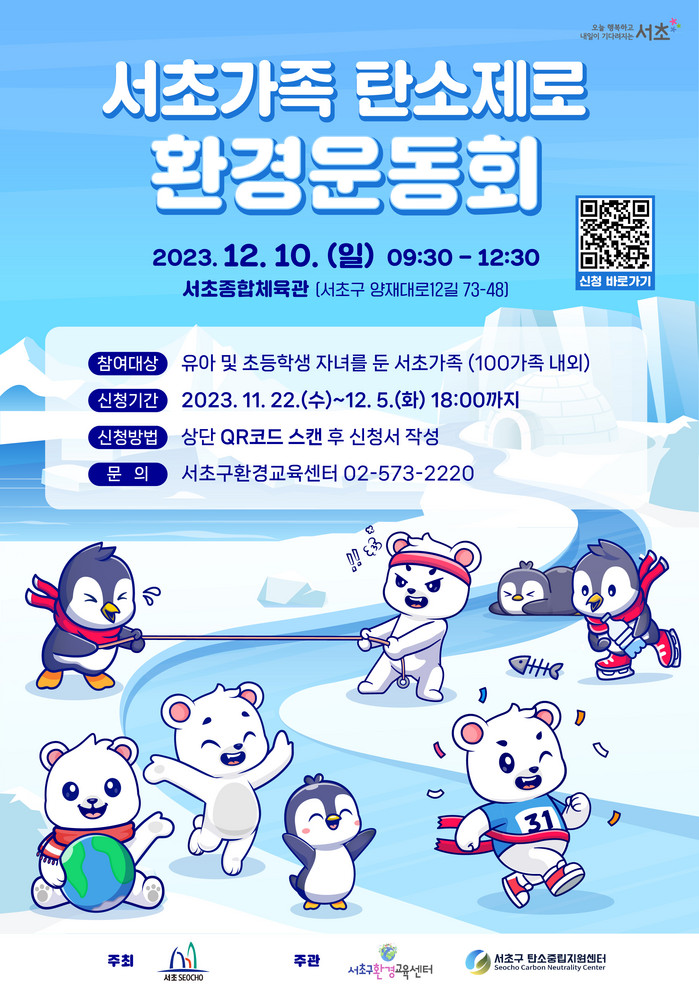 서울 서초구(구청장 전성수)는 오는 10일 '서초가족 탄소제로 환경운동회'를 서초종합체육관(양재대로12길 73-48)에서 연다.