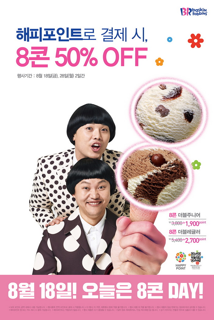 '8콘데이'는 해피포인트로 8콘을 구입하면 50% 할인 혜택을 제공하는 행사다. '8콘'은 배스킨라빈스의 '더블 주니어'와 '더블 레귤러'등 두 가지 맛을 한 번에 즐길 수 있는 사이즈를 일컫는 별명이다. '8콘데이'에 참여하면 더블 주니어는 1900포인트, 더블 레귤러는 2700포인트에 구입할 수 있다.