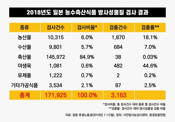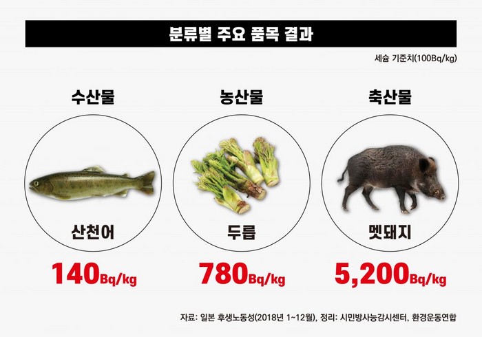 환경운동연합과 시민방사능감시센터는 2018년 일본 후생노동성의 '농수축산물 방사성물질 검사 결과자료'를 분석한 결과 방사성물질인 세슘이 어류 18종에서 검출됐다고 2일 발표했다.