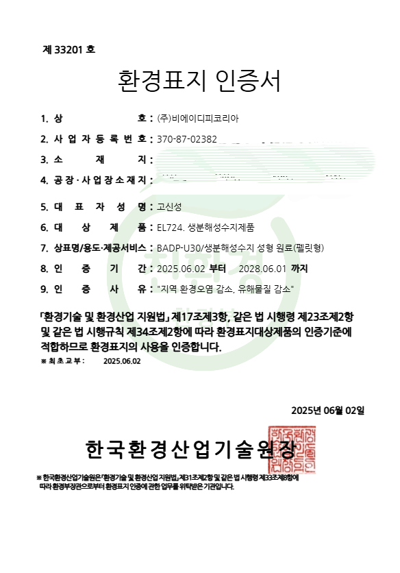 (주)BADP코리아는 이번 인증을 발판으로 △국내외 대형마트 및 유통사와 친환경 포장재 공급망 구축 △국책 과제 및 민간 연구 과제 수주 △적용품목 확장 R&D 등을 추진해 나갈 계획이다.