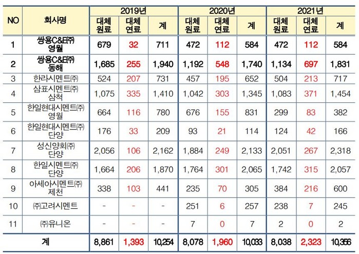 ▲국내 시멘트 업계 폐기물 사용량 현황, 매년 폭발적으로 늘어나고 있는 것으로 확인되고 있다. |