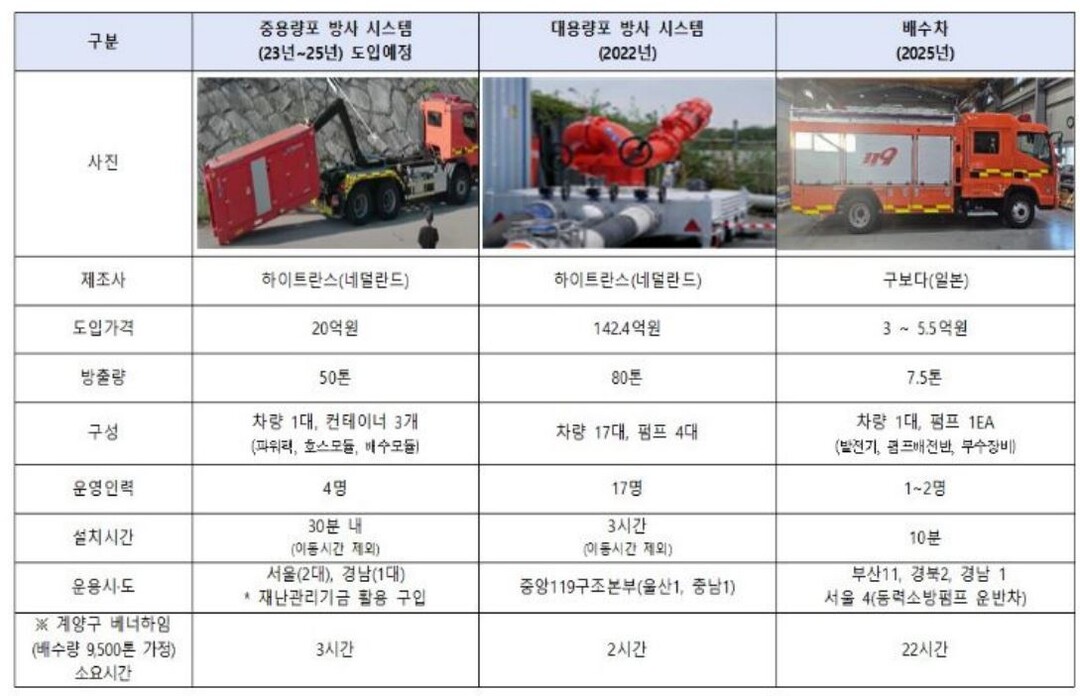 중용량포 방사 시스템은 서울·경남에 3대, 대용량포 방사 시스템은 울산·충남에 2대, 배수차는 서울·부산·경상권에 총 18대가 집중적으로 배치된 반면 경기·인천 및 호남지역에는 사실상 전무한 것으로 확인됐다.