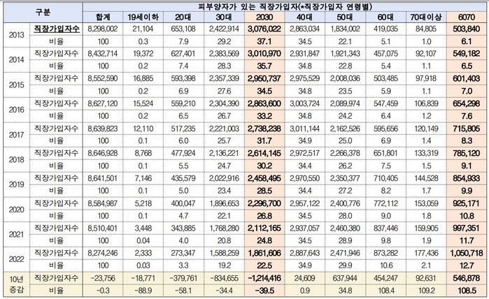 2013년 피부양자가 있는 20‧30대 직장가입자는 307만 6022명이었으나, 2022년에 186만 1,606명으로 10년 새 121만 4416명, 비율로는 39.5%가 감소했다.