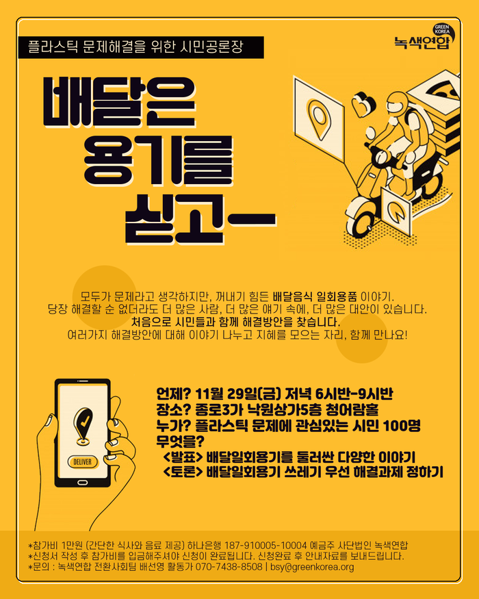 [환경데일리 한영익 기자]'배달은 용기를 싣고' 주제로 시민들이 참여해 다양한 의견을 주고 받는 공론장이 열린다.
