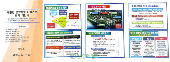 [환경데일리 김영민 기자]고양시(시장 최성)는 지난 19일부터 23일까지 '대통령 공약사항 이행 관련 정책제언서'를 청와대와 국정기획자문위 및 정부 관련 부처에 제출한다고 밝혔다.