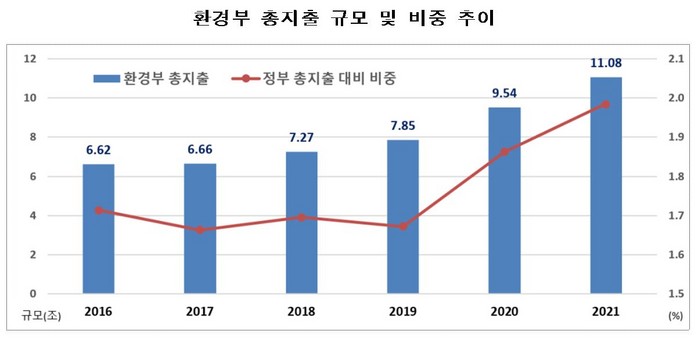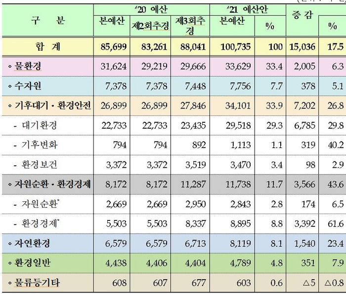 환경부(장관 조명래)는 2021년도 환경부 소관 예산 및 기금안의 총지출을 11조 777억 원으로 편성, 9월 3일 국회에 제출할 예정이라고 밝혔다. 예산안은 전년도 8조 5699억 원 대비 1조 5036억 원(17.5%) 증액된 10조 735억 원, 기금안은 전년도 9694억 원 대비 348억 원(3.6%) 증액된 1조 42억 원이다.