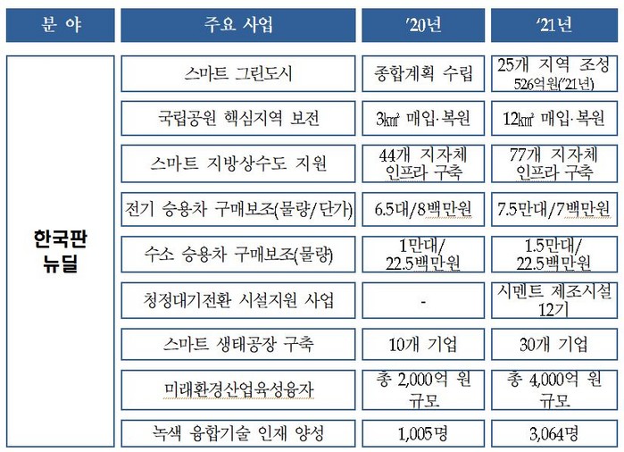 이번 환경부의 그린뉴딜 전체 예산편성안 중 그린뉴딜 이행과 물 안전에 집중한 2021년도 환경부 총 지출은 전년도 대비 16.1% 증액된 11조 777억 원이다. 예산안은 전년도 8조 5699억 원 대비 17.5% 증액된 10조 735억 원이며, 기금안은 전년도 9694억 원 대비 3.6% 증액된 1조 42억 원으로 모두 역대 최대 규모에 해당한다.