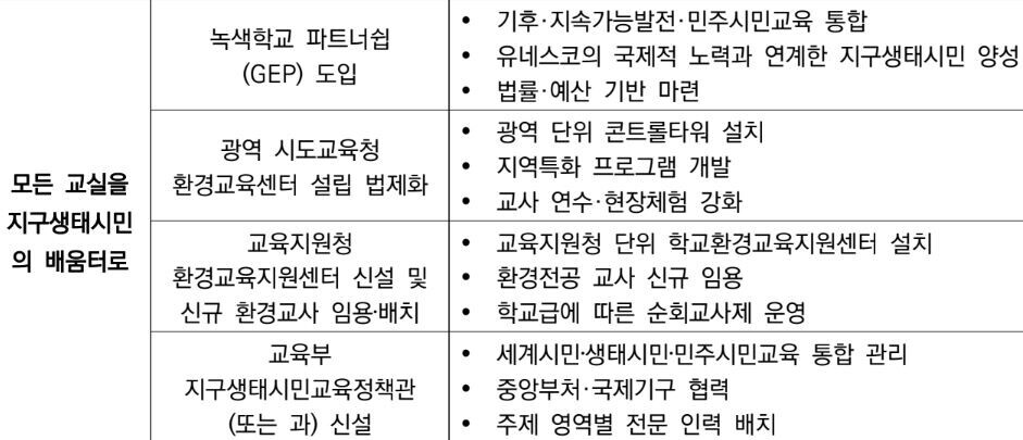 국가와 지역의 환경교육 추진체계를 전반적으로 개선한다. 기후부 출범에 맞춰 기후환경교육 중심에서 에너지교육을 포괄하는 통합적 관점의 교육으로 전환한다. 이를 위해 거대사(빅히스토리) 지속가능발전목표(SDGs, Sustainable Development Goals) 등과 연계한 융합교육을 강화한다.