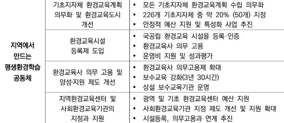 지역의 환경문제 해결과 탄소중립 실천을 위한 환경학습 모임을 다각화하고 지역센터, 대학 등 환경교육 전문기관과 연계해 시민이 주도하는 참여형 환경교육을 지역사회에 내재화한다. 이와 관련, 우수 지자체의 환경교육도시 지정을 확대하고 도시 전체로 환경교육 성과가 확산되도록 행정 및 재정적 지원도 강화한다.