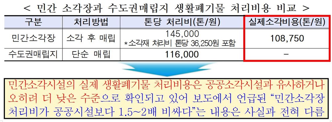 한 발 더 나아가, 실제로 민간소각장 평균 처리비는 톤당 26만6000원으로, 공공(소각)시설 12만∼16만 원보다 1.5∼2배 비싸다는 악의적으로 보도했다.