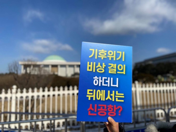 국회 국토위가 신공항 특별법안을 통과시킨다면 기후위기 비상 대응 촉구 결의안이 한낱 종이조각에 불과했음을 인정하는 꼴이 된다고 비판했다.