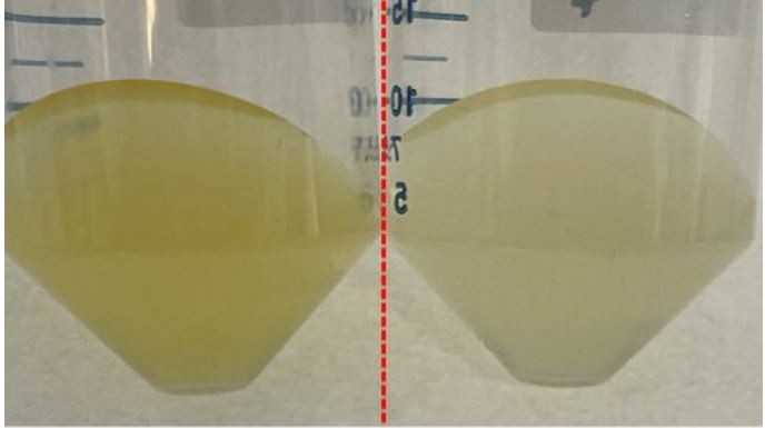 ▲'플라보박테리움 체니애' N2820의 배양 (좌) 빛이 있는 조건 (우) 빛이 없는 조건 |