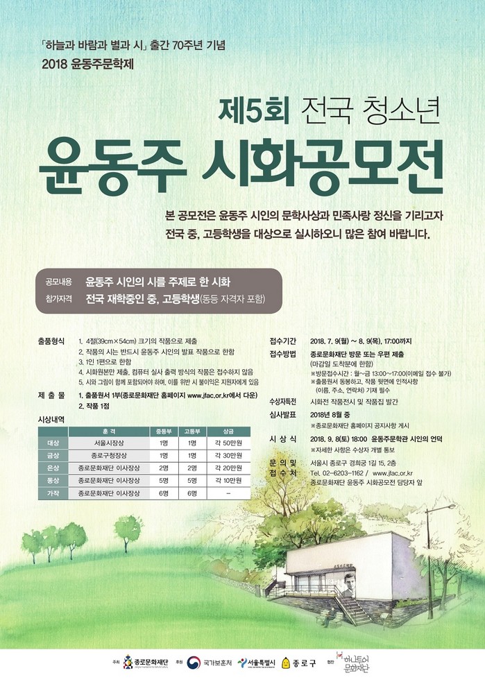 윤동주 시화공모전은 시인의 문학사상과 민족사랑 정신을 되새기기 위해 전국 중·고등학생(동등 자격자 포함)을 대상으로 실시한다. 윤동주 시인의 시를 주제로 한 시화 작품을 4절 크기로 제출하면 되며 시와 그림이 함께 포함돼야 한다. 원본만 제출할 수 있고 컴퓨터 실사 출력 방식의 작품은 접수하지 않는다. 방법은 출품원서 1부와 작품 1점을 종로문화재단(종로구 경희궁 1길 15, 2층) 방문 또는 우편으로 제출하면 된다.