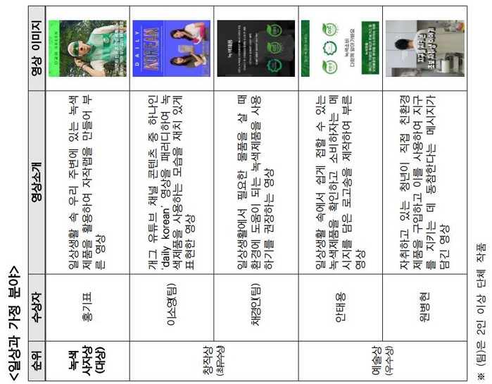 공모전은 우리 일상과 주변에서 쉽게 찾을 수 있는 녹색제품에 대해 국민의 관심을 불러일으키고 나아가 친환경 생활을 실천하도록 이끌기 위해 6월부터 시작됐다. 공모전은 총 135편이 참여했다.