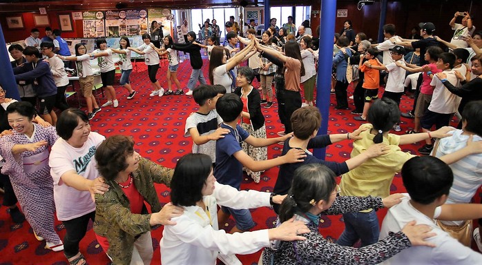 | ▲한일 참가자가 모여 한국전통 춤 ‘강강술래’를 배우고 추는 모습 |
