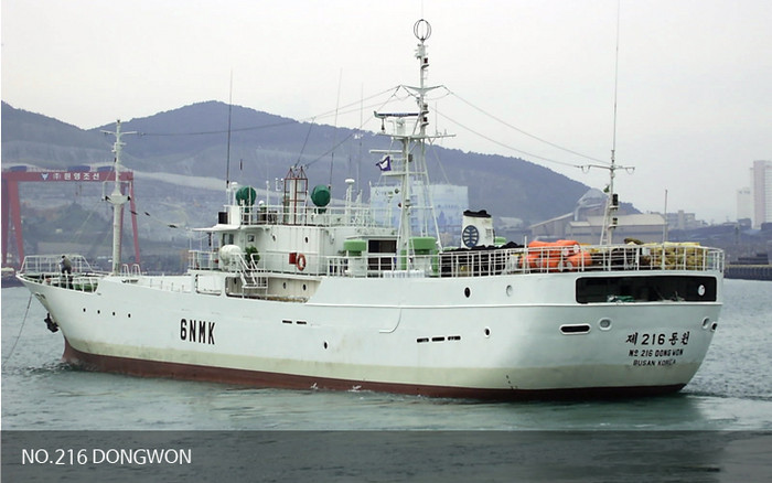 | ▲동원산업이 보유하고 있는 참치 연승선 동원 216호, 주낙(낚시)을 사용 눈다랑어, 황다랑어 등을 어획하며, 품질과 선도유지를 위해 어획 즉시 영하 60도의 어창에서 보관한다. 조업구역은 남태평양과 인도양으로 연간 생산량은 약 6000톤 정도 이며, 대부분 횟감용으로 판매되고 있다. 연승어법은 길이 약 150 km에 이르는 모릿줄(main line)에 약 50~70m 간격으로 약 3000여 개의 아릿 줄(branch line)을 달아 그 끝에 미끼(오징어, 고등어, 청어 등)를 끼워 참치가 낚시에 걸리도록 하는 어획방법이다. |