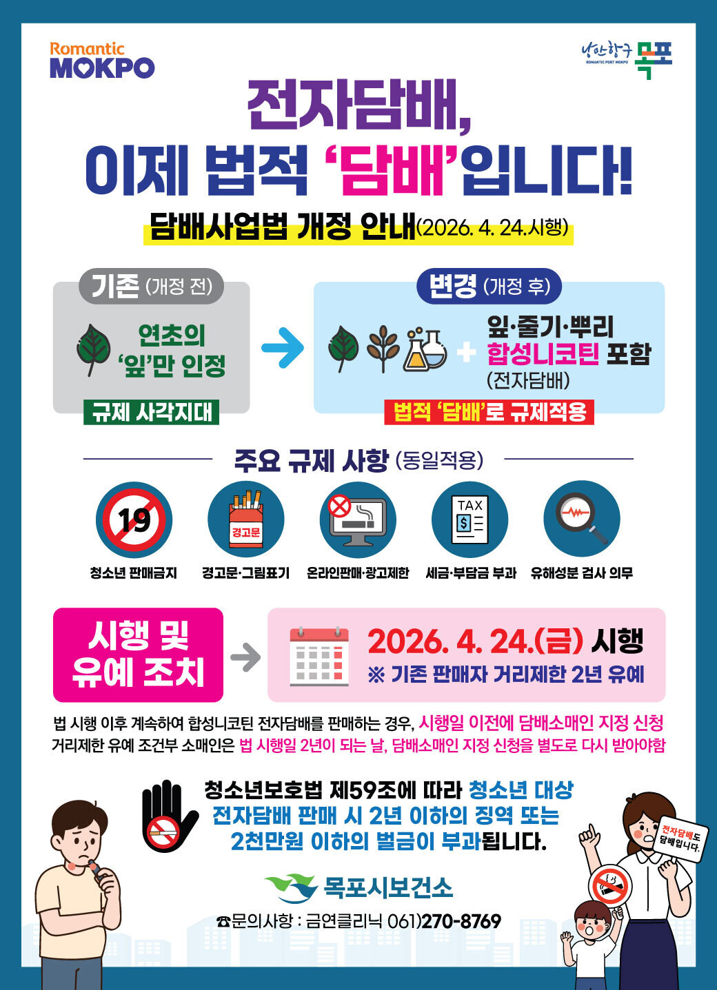 이런 가운데 목포시는 '담배사업법'개정 시행에 따라 액상형 전자담배가 공식적인 규제 대상에 포함됐음을 알리고 시민들의 주의를 당부했다.