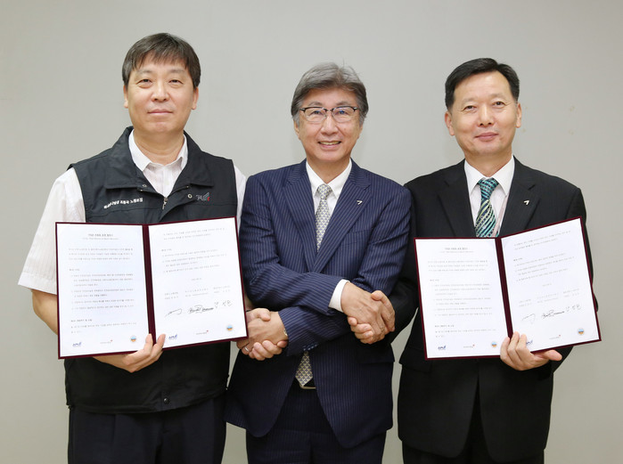 | ▲서울시 강서구 오정로 아시아나타운에서 야마무라 아키요시 안전보안실장(가운데), 민성식 아시아나항공 조종사노동조합 위원장(왼쪽), 강성천 아시아나항공 열린 조종사노동조합 위원장이 안전운항 개선을 위한 ‘FOQA 위원회 협정’을 체결한 후 기념촬영을 하고 있다. © 환경데일리 |