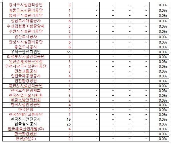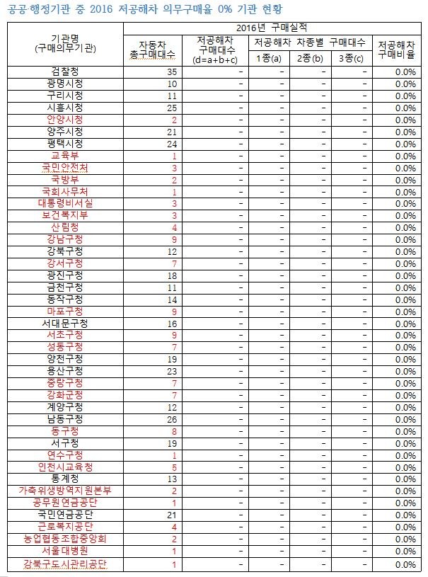 세부 현황을 살펴보면 저공해차 구매비율이 0%인 기관도 70곳에 달했다. 행정기관 중에는 강남구청을 비롯해 서울시 13개 구청, 인천시 6개 구청, 경기도 6개 시청 등의 달성율이 0%였다. 공공기관 중에는 환경부 산하 기관인 한국환경공단, 인천환경공단 등의 달성률이 0%였다. 차량 구매대수가 많은 검찰청, 우체국물류지원단, 한국철도공사 등이 0%의 달성률을 보였다.