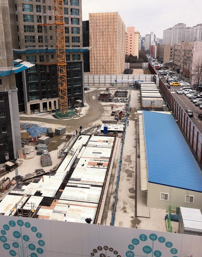 ▲미세먼지 날림먼지가 가장 많이 배출되는 곳 중 건설현장이다. 물뿌리기는 형식적이지만, 실제 가장 많이 콘트리트 가루 등이 많이 날리는 곳이 신축건물 내부다. 국립환경과학원은 국내 유통되는 시멘트에는 많은 중금속이 함유돼 있다고 밝히고 있다. 공사과정에서 대기중으로 많이 배출돼 근본적인 대책이 요구되고 있다. 사진 최진경 기자 |